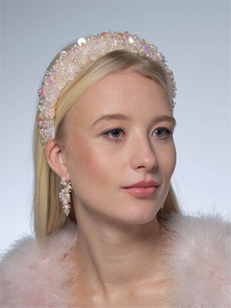Diadeem versierd met parels, kristalletjes, kraaltjes en pailletten | rosé- en ivoorkleurig