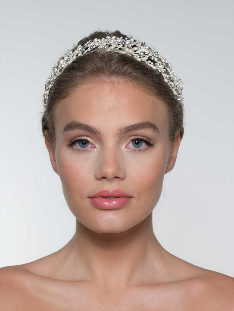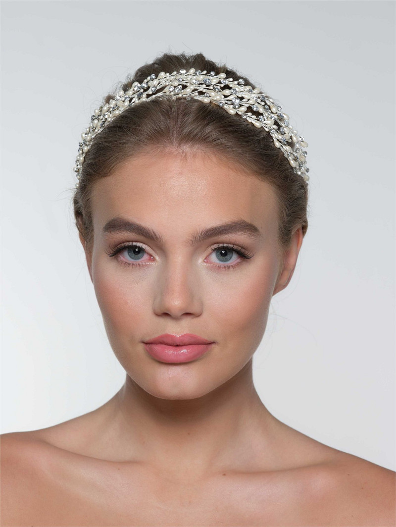 - Met ivoorkleurige pareltjes en strasssteentjes.