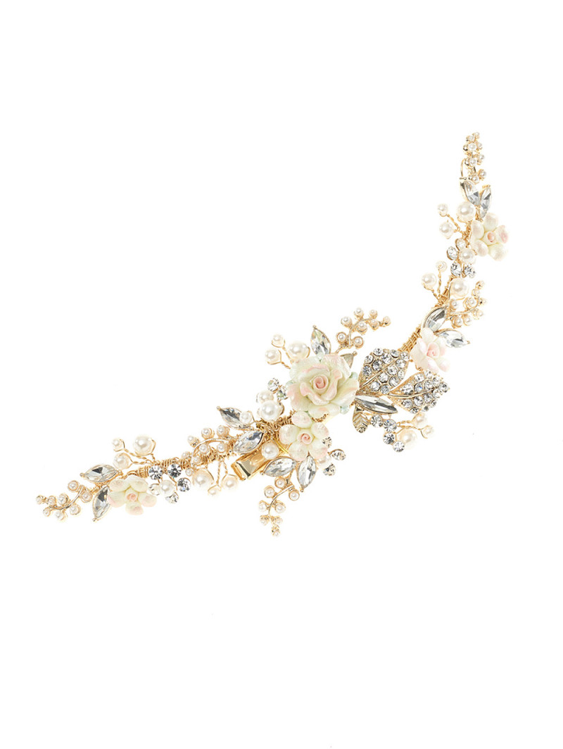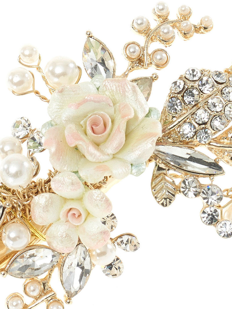 - Goudkleurig haarsieraad op clip met porseleinen bloemetjes in pastelkleuren, blaadjes van strasssteentjes en ivoorkleurige pareltjes
