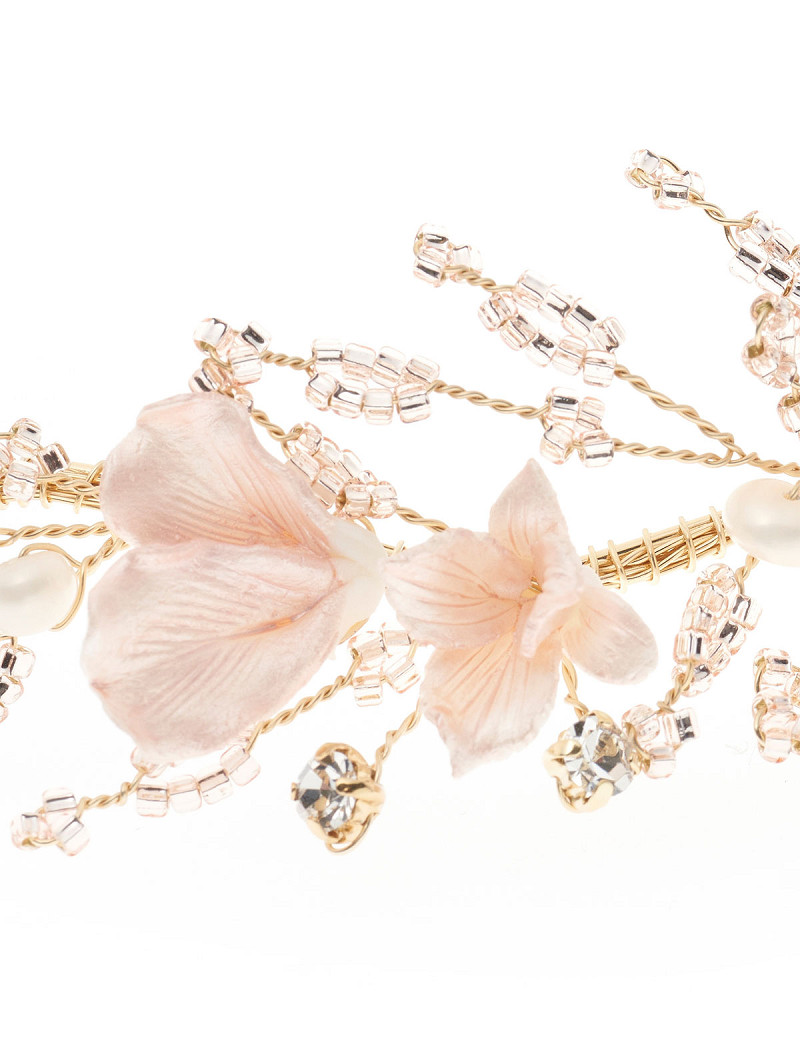 - Goudkleurig haarsieraad met roze porseleinen bloemetjes, ivoorkleurige parels, strasssteentjes en kristalletjes