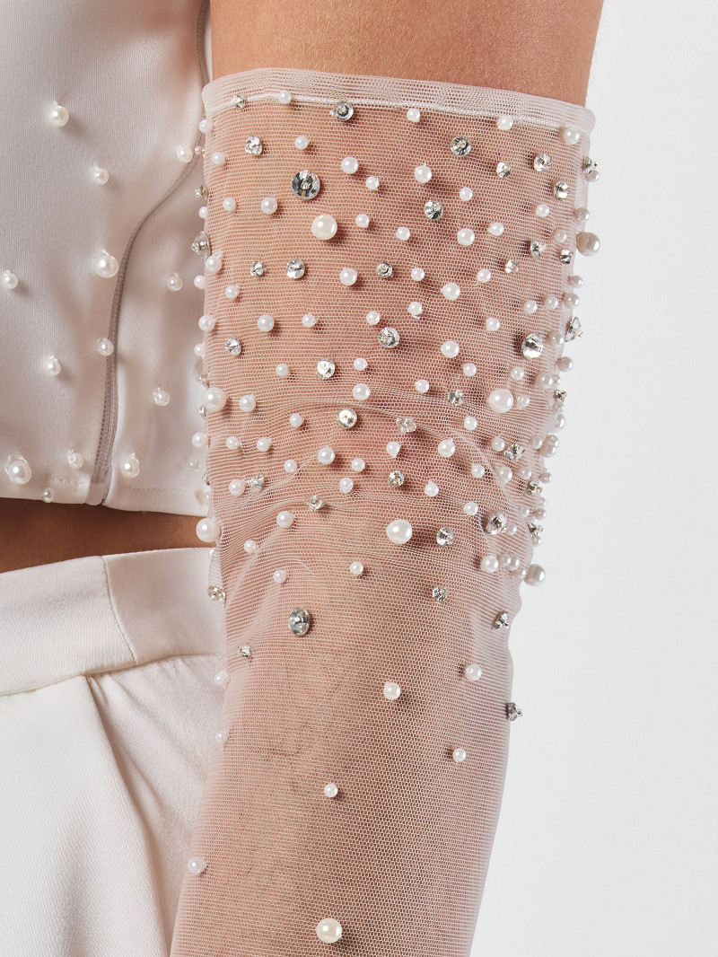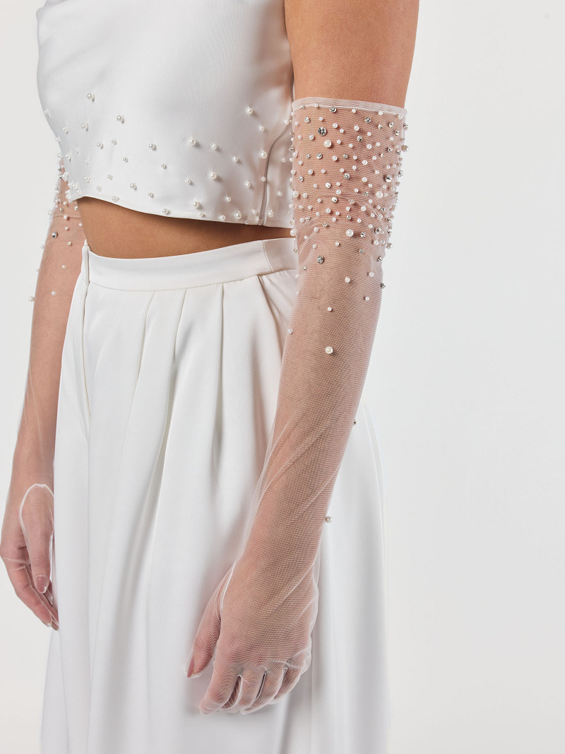 - Lange handschoenen van ivoorkleurige stretch tule uit de Poirier Collection.