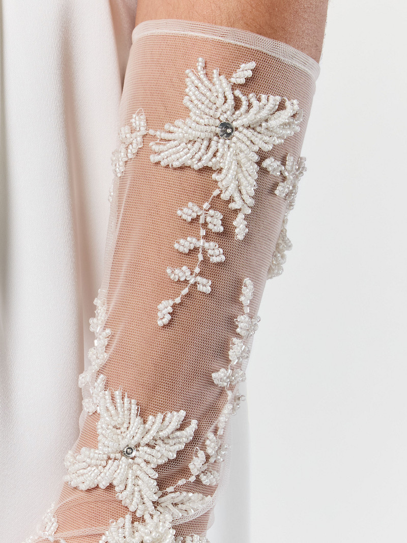 - Halflange ivoorkleurige handschoenen van stretch tule uit de Poirier Collection.