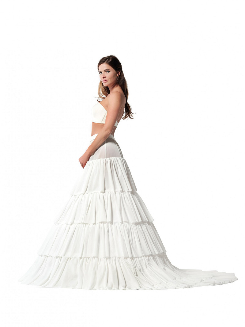 - Kenmerken: Petticoat, 4 baleinen, 5 charmeuse stroken, sleepje, omtrek: 380 cm, lengte: 110 cm, ivoorkleurig, maten: XS t/m XXXXL
