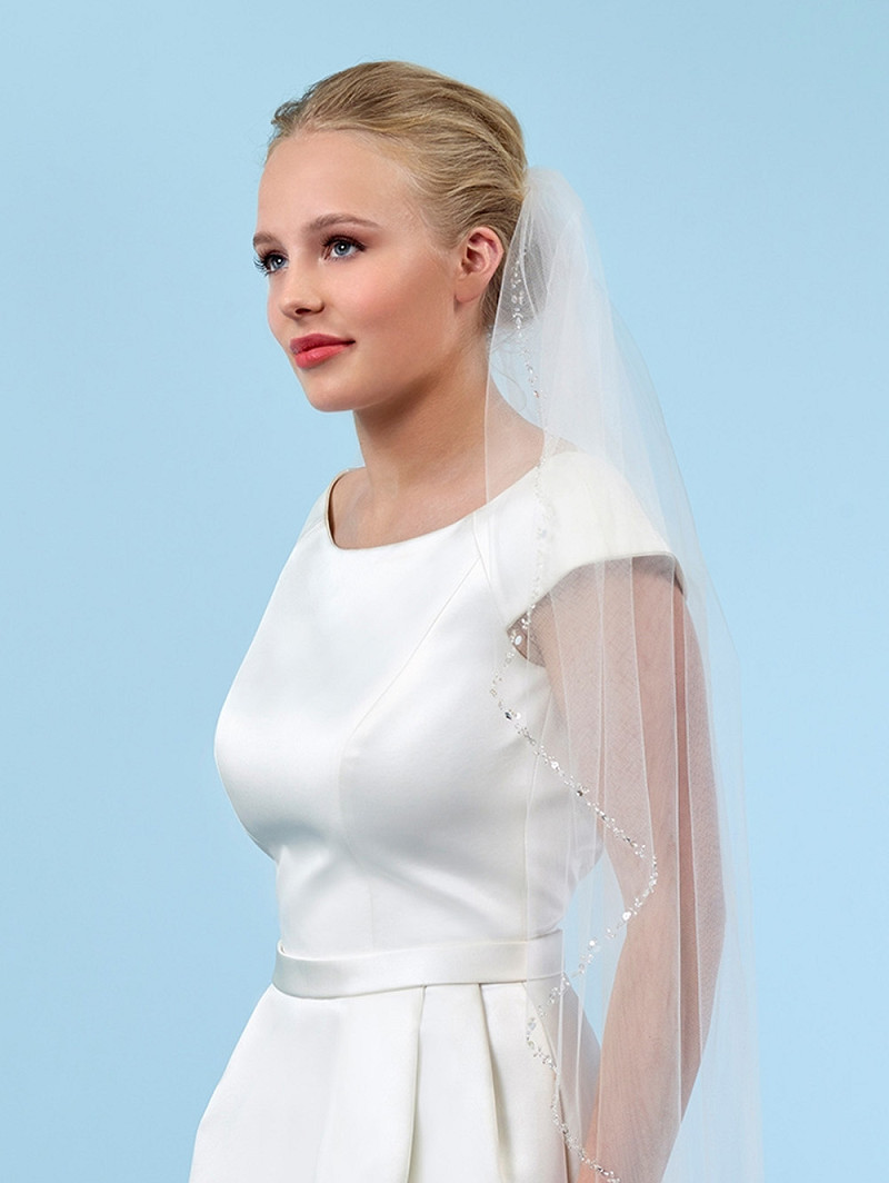 • Product: S126-075/1/Med – Sluier gemaakt van enkellaagse medium-tule versierd met kraaltjes, pailletten en strasssteentjes | 75 cm lang