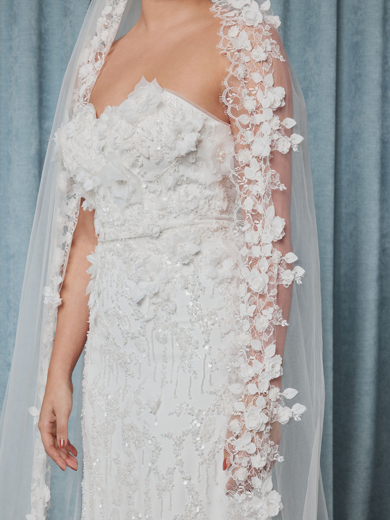 - Aan de rand Franse kant versierd met 3D bloemen met parels en kristallen.