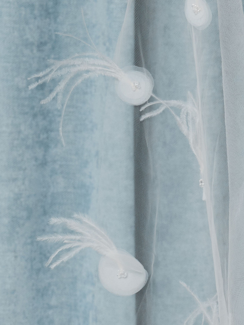 - Versierd met organza applicaties met Swarovski kristallen en struisvogelveertjes.