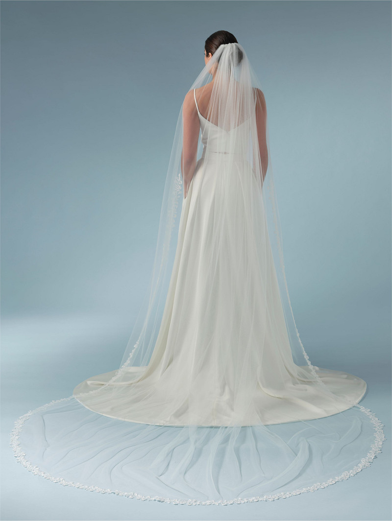 Sluier van enkellaagse soft-tule met geborduurd kanten bloem- en takjesmotief, kraaltjes en pailletten | lengte: 300 cm