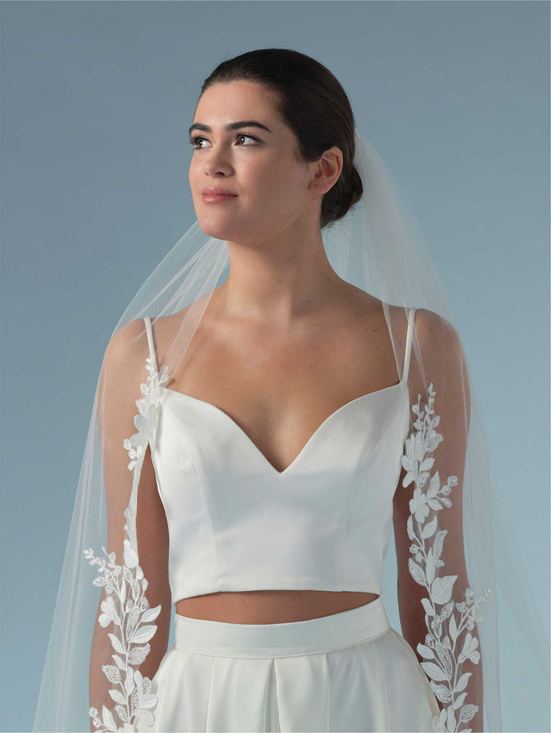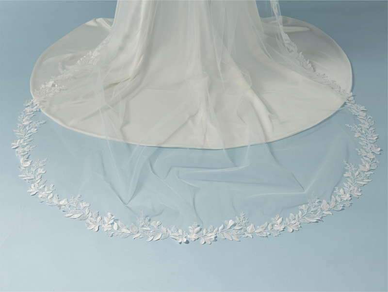 Sluier gemaakt van enkellaagse medium-tule versierd met een geborduurd bloemmotief | lengte: 300 cm