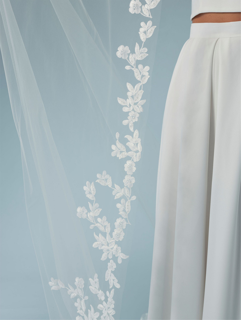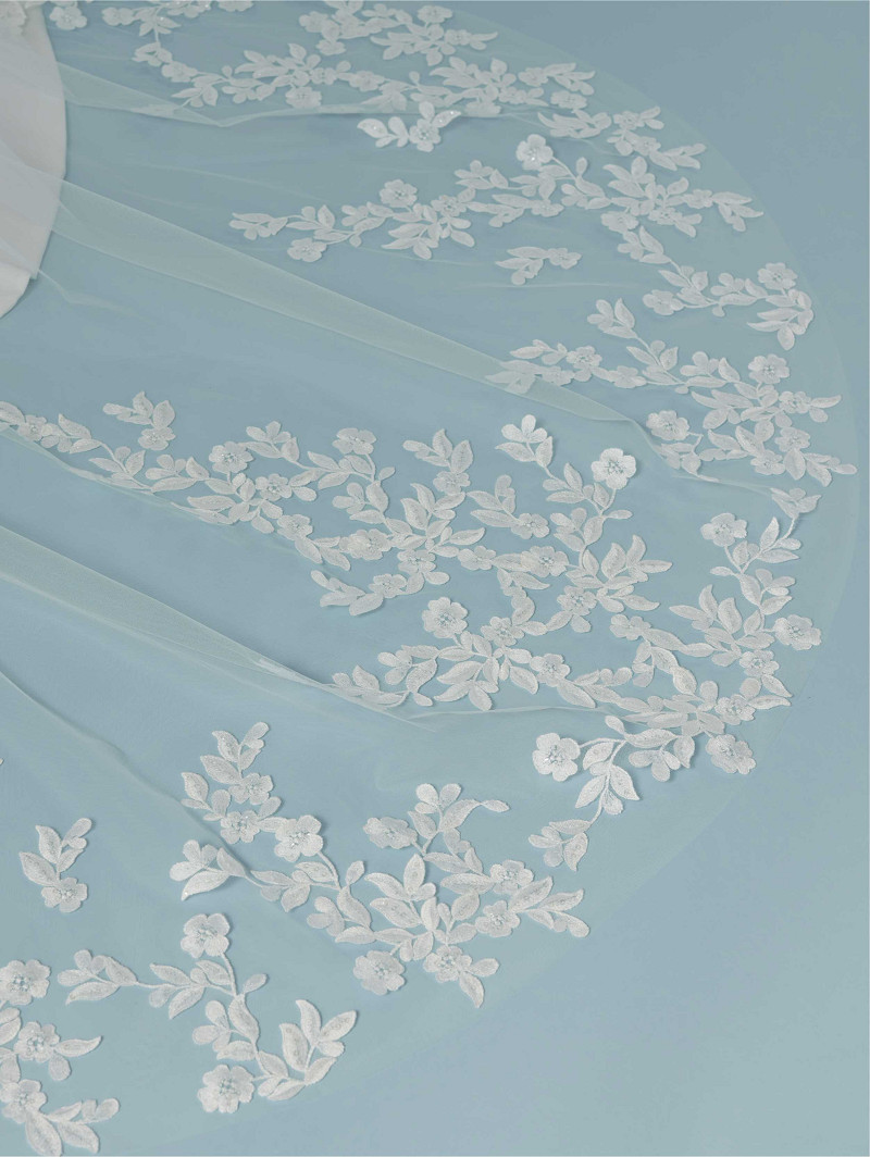 Sluier gemaakt van enkellaagse medium-tule versierd met een kanten bloem- en blaadjesmotief met pailletjes | lengte: 300 cm