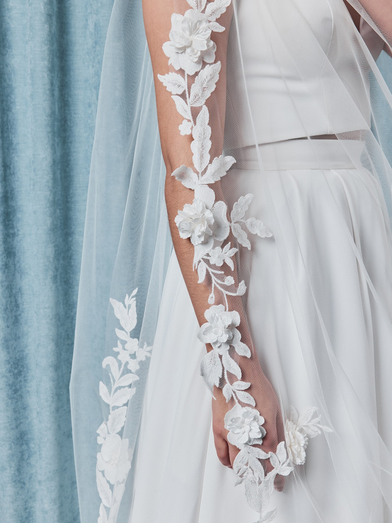 S75509-300/1/MD - Sluier van enkellaagse medium-tule versierd met 3D bloemetjes