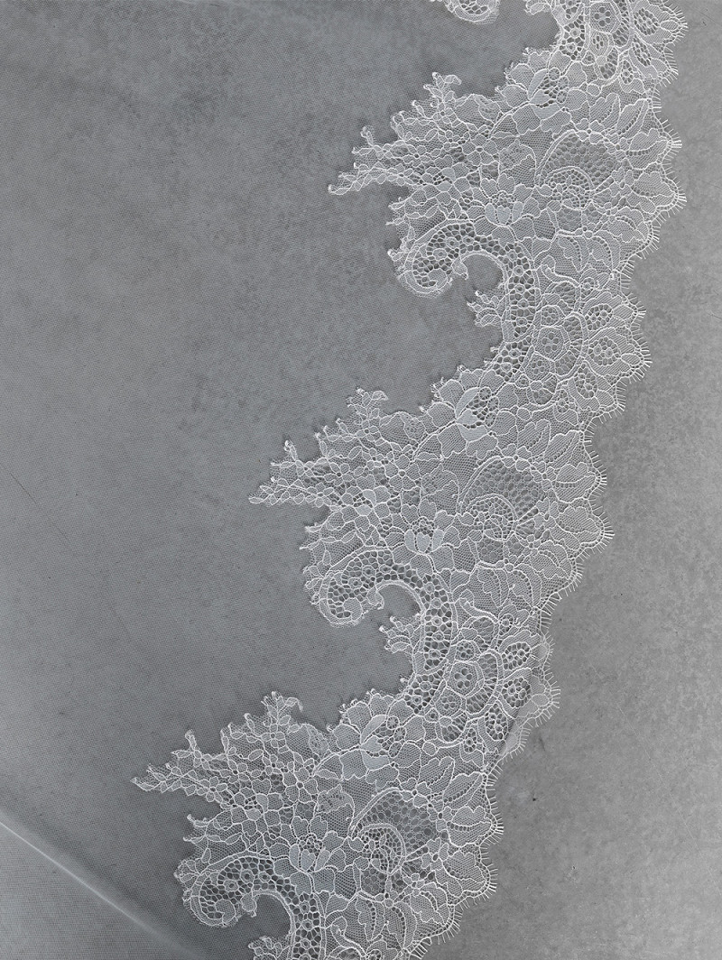 Enkellaags sluier bestaande uit één laag medium tule, afgewerkt met Parijse kant. Lengte 300 cm.