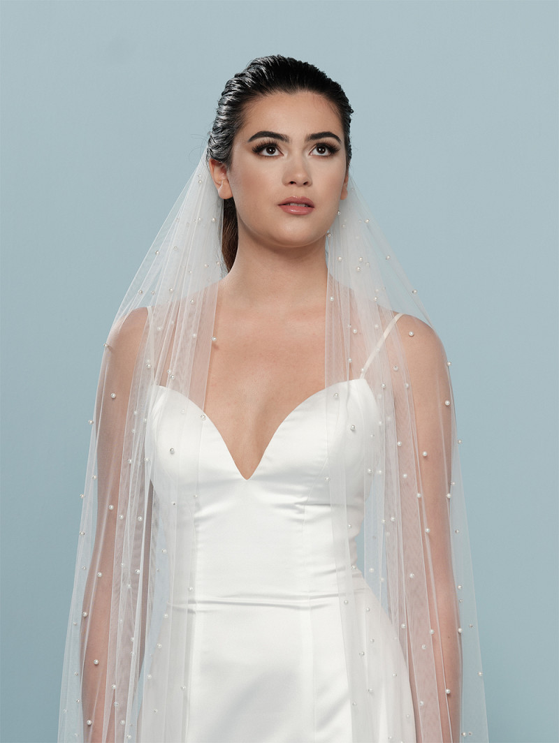 Ivoorkleurige soft-tule sluier met ivoorkleurige parels