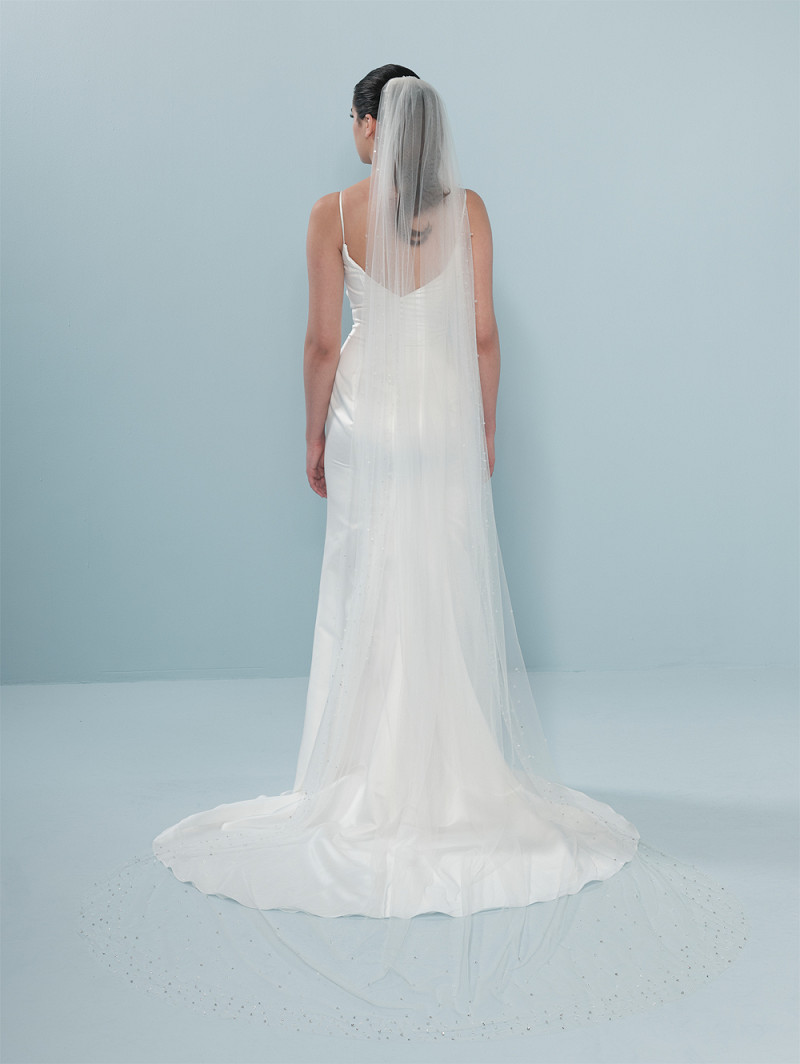 - Enkellaags soft-tule sluier die aan de kanten van boven tot onderaan versierd is met kristallen en pailletten