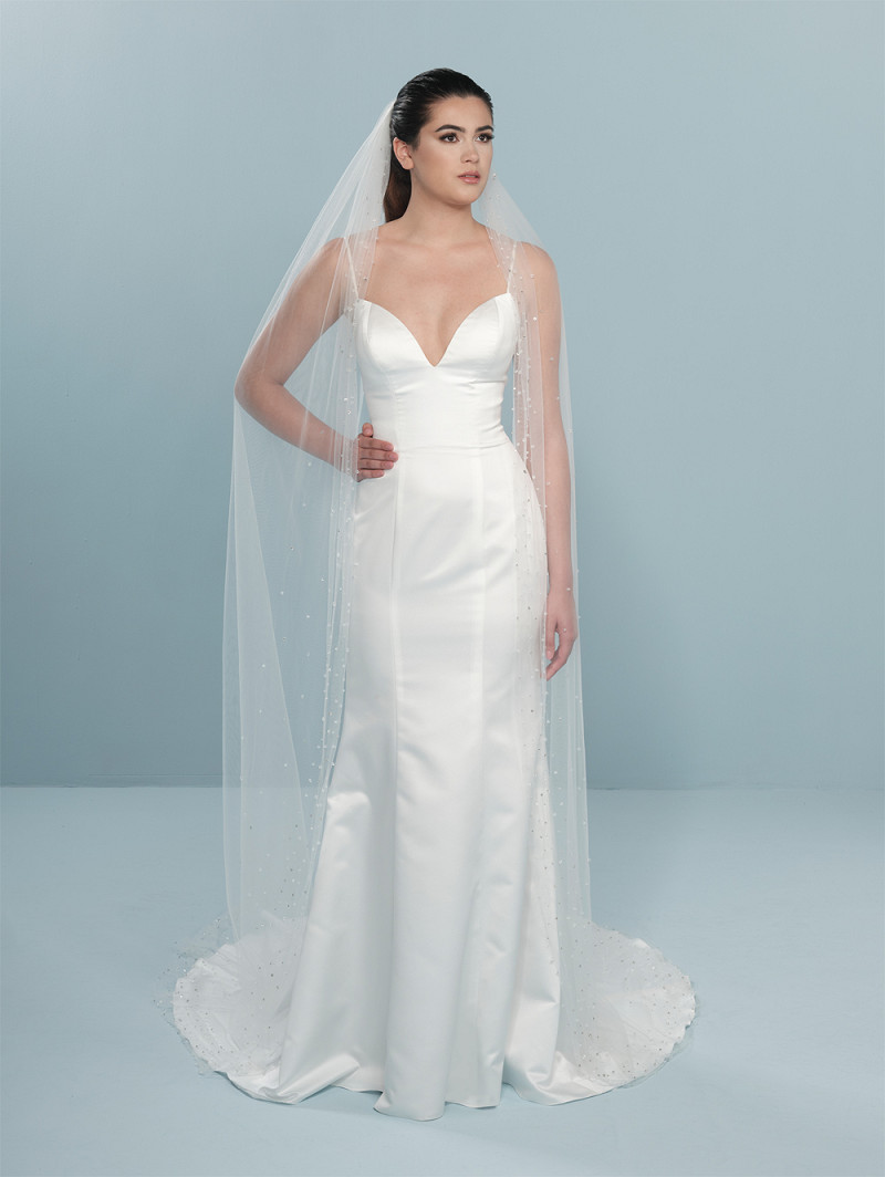 - Wanneer jij een ware fashionista bent dan is deze sluier jouw ultieme fashion item. Deze enkellaags soft-tule sluier heeft aan de kanten van boven tot beneden zilverkleurige pailletten en kristallen. De sluier heeft een lengte van 300 cm.