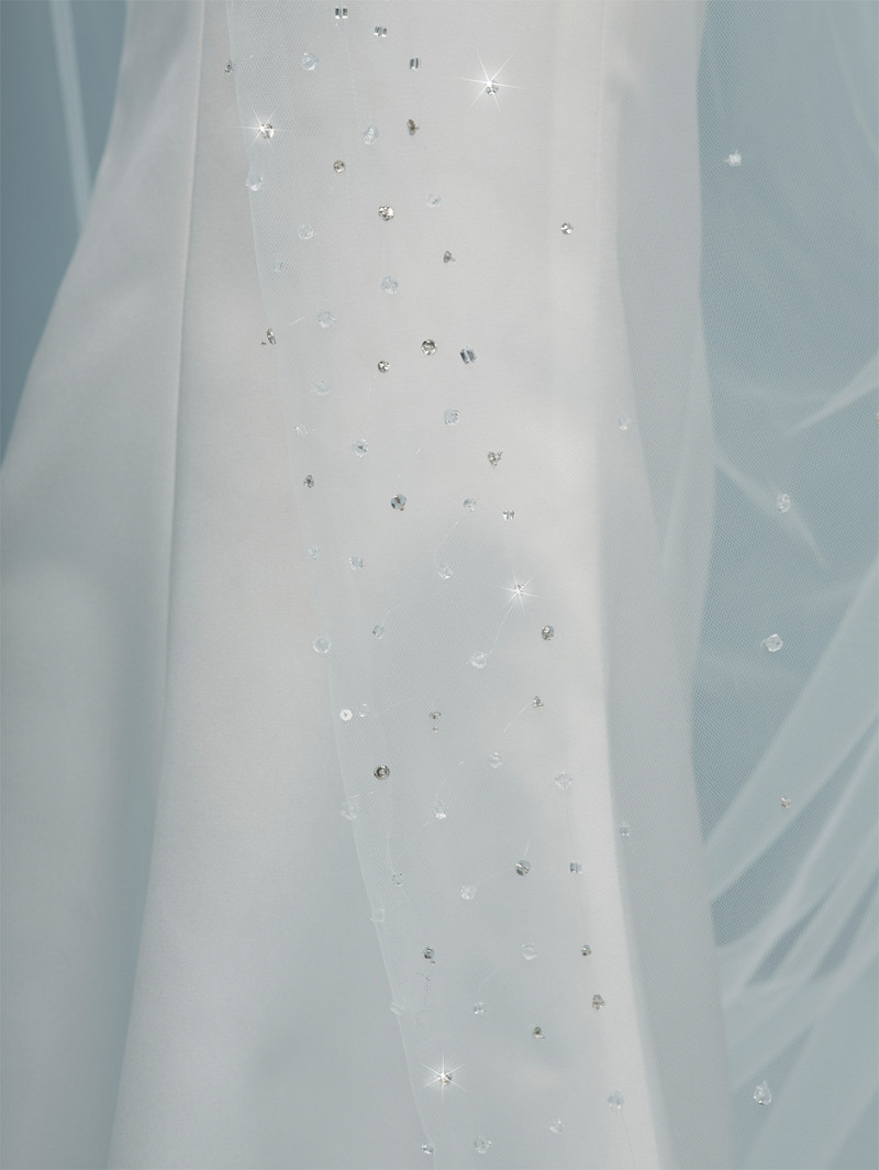 - Enkellaags soft-tule sluier die aan de kanten van boven tot onderaan versierd is met kristallen en pailletten