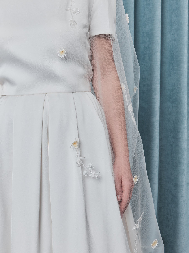 - Versiering van geborduurde margrietjes in geel/wit.