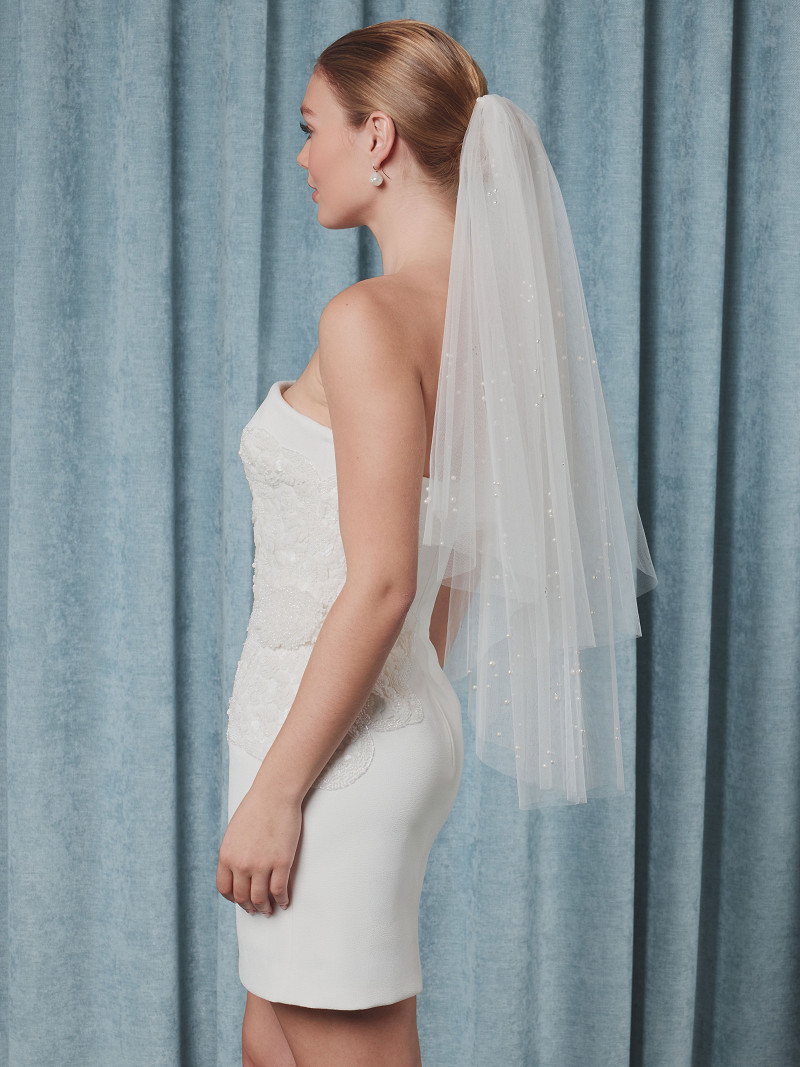 - Versierd met matte parels en strasssteentjes over de hele sluier.
