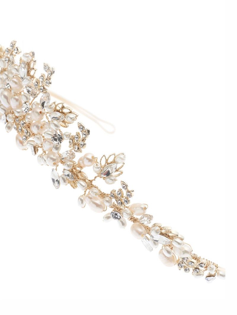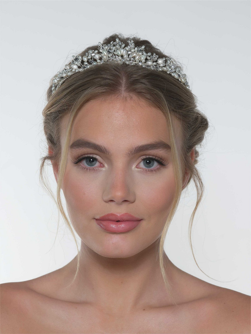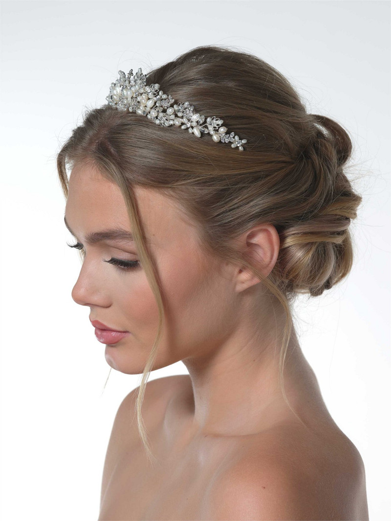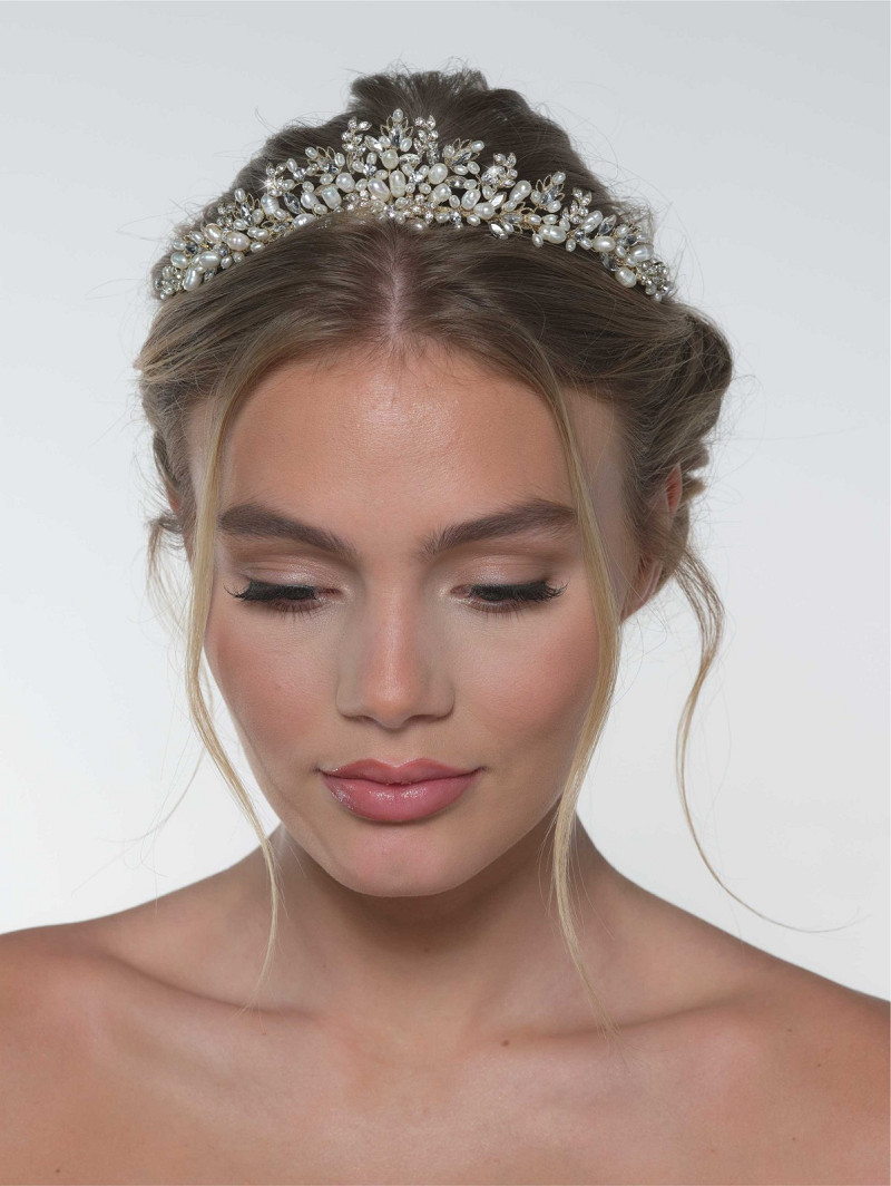 Tiara met opstaande rand versierd met strasssteentjes en zoetwaterparels