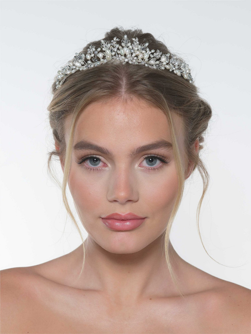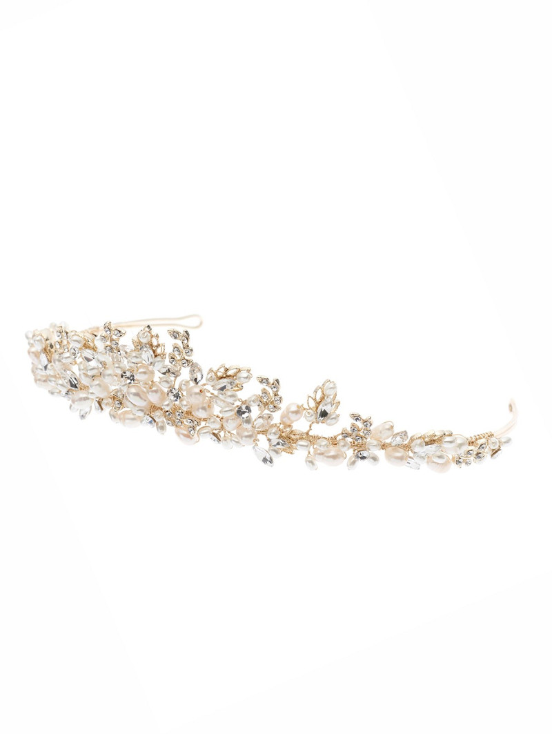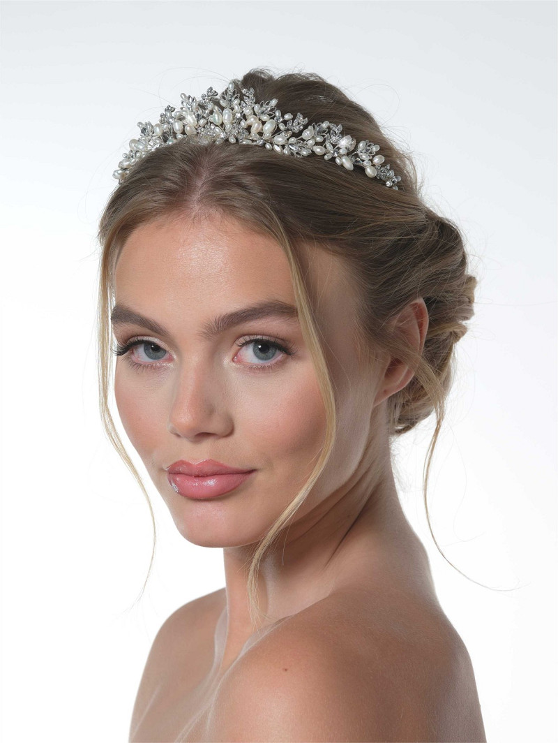 Tiara met opstaande rand versierd met strasssteentjes en zoetwaterparels