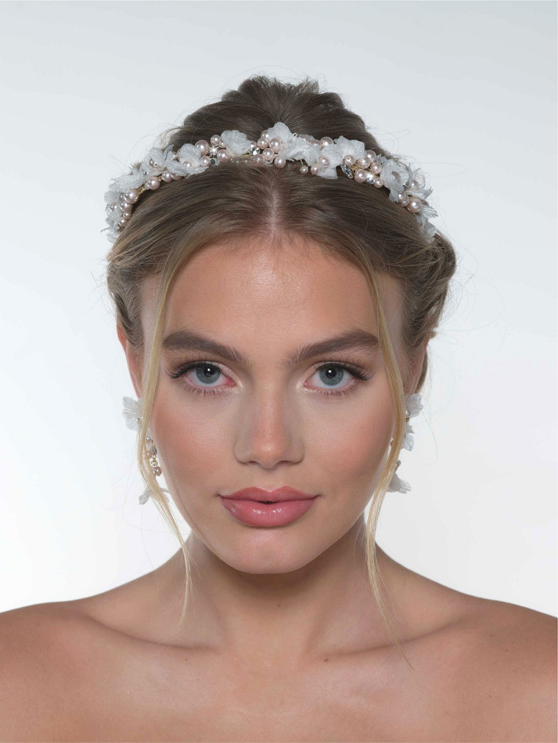Tiara versierd met stoffen bloemetjes, parels en strasssteentjes