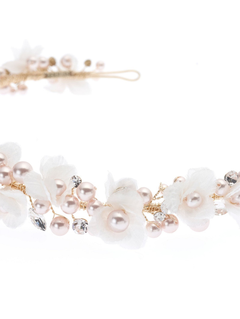 - Versierd met stoffen ivoorkleurige bloemetjes met rosékleurige parels en strasssteentjes.