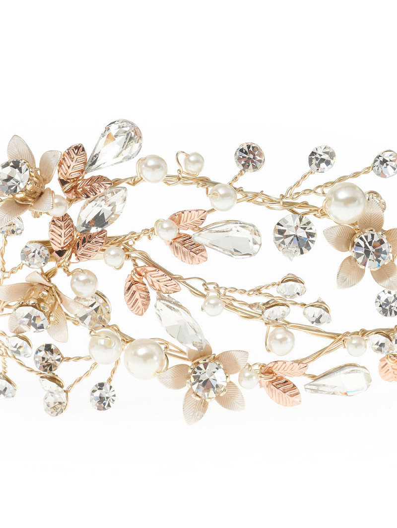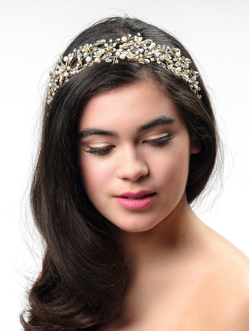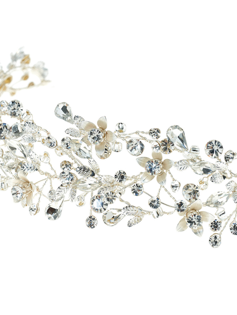 - Zilverkleurig of goudkleurig haarsieraad afgewerkt met kristallen, strasssteentjes en parels
