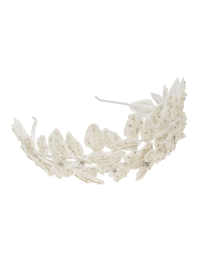 Tiara versierd met geborduurde blaadjes, kraaltjes en strasssteentjes
