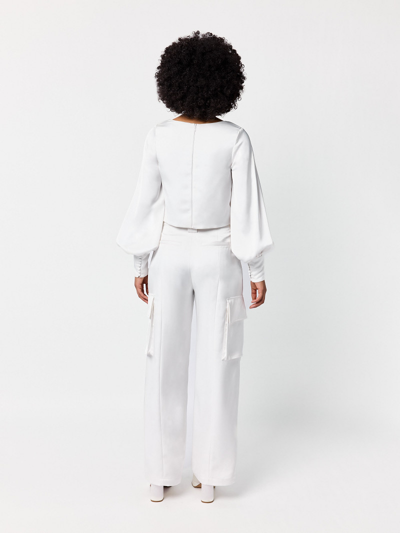 Bridal top gemaakt van matte satijn met boothals en lange pofmouwen met manchetten | GEM Collection | Lucia-lijn
