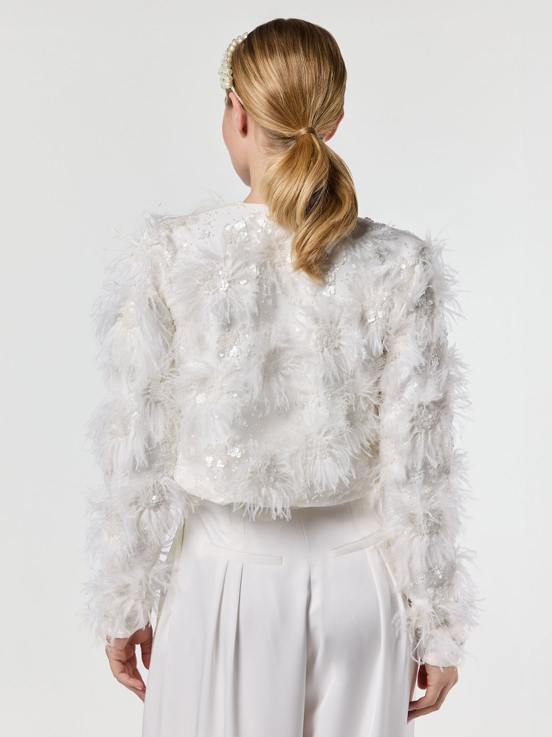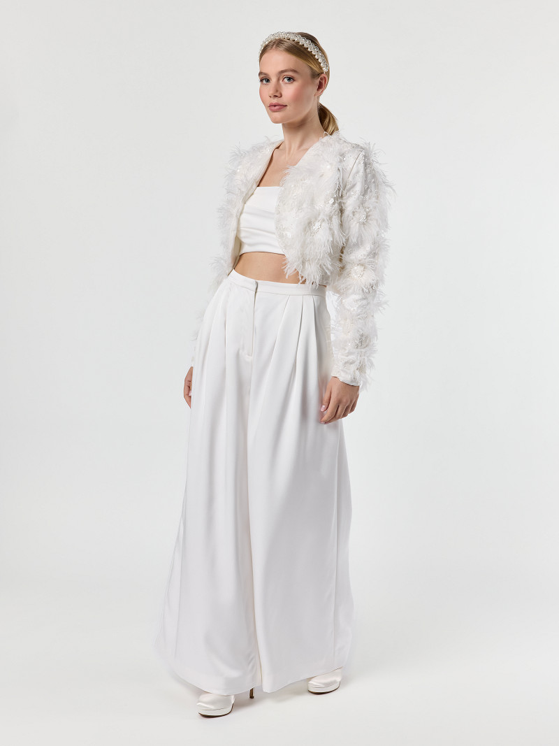 - Bolero jacket van ivoorkleurige matte satijn met tule laag uit de Poirier Collection.