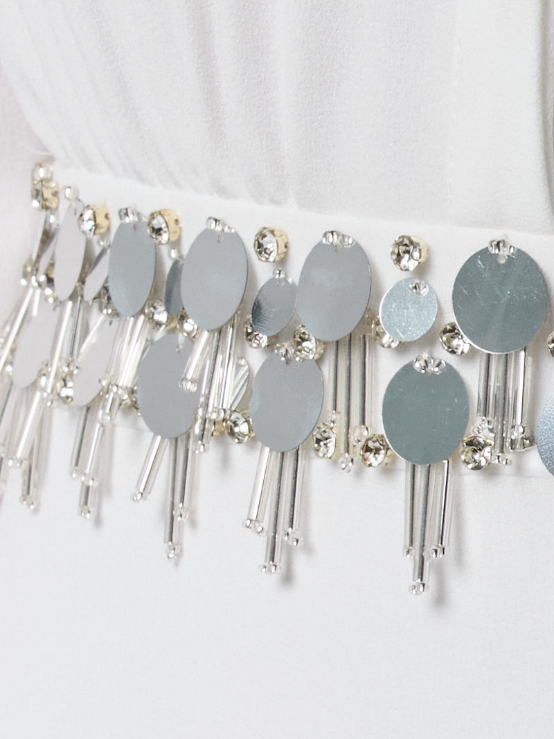 - In de taille een versiering van zilverkleurige pailletten, beads en strasssteentjes.