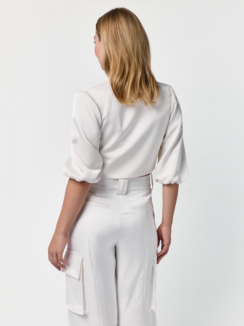 Bruidsjacket gemaakt van ivoorkleurige, matte satijn met pofmouwen | GEM Collection | Lucia-lijn