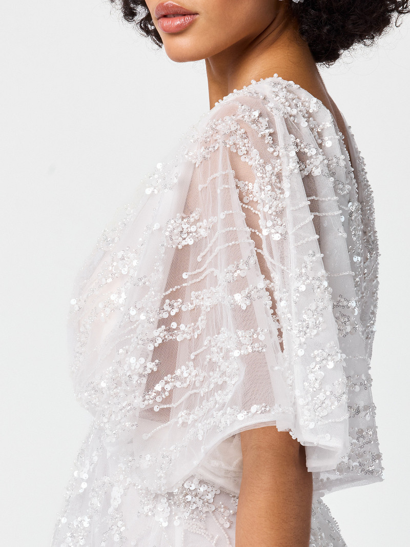 DS-75120 - Prachtige korte ivoorkleurige kanten jurk uit de Armelle-lijn van de GEM Collection, versierd met pailletten, pareltjes en kraaltjes