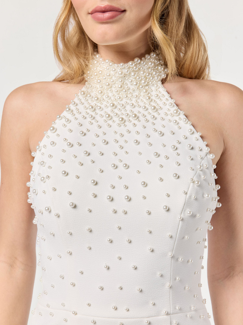 - Aan de achterkant voorzien van parelknoopjes aan de hals en een ritssluiting.
