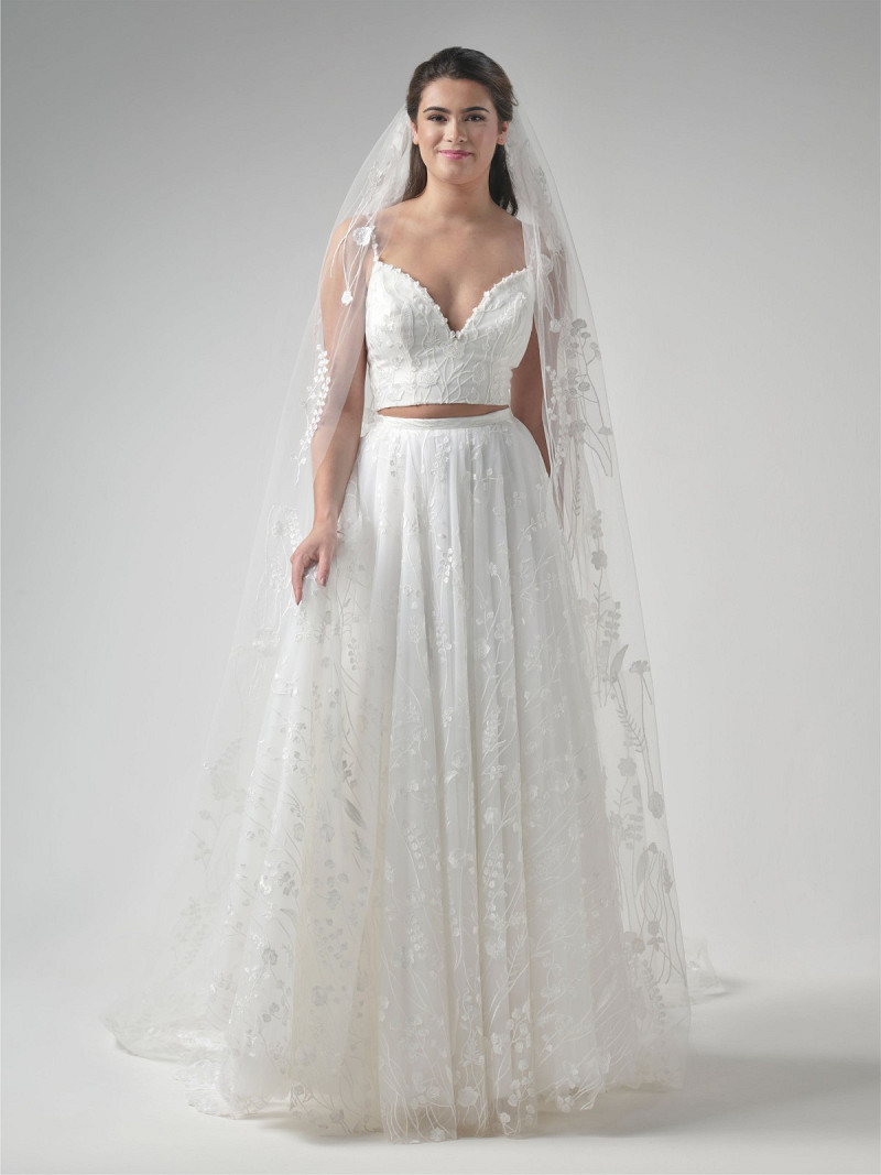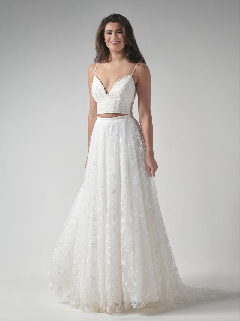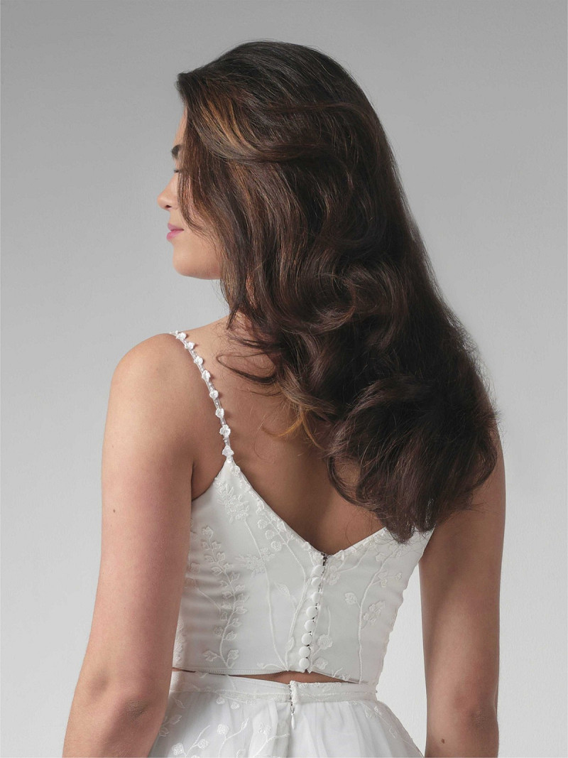 Bridal crop top gemaakt van fijne, ivoorkleurige kant versierd met een geborduurd ivoorkleurig bloemmotief | Deluxe uitvoering | GEM Collection | Geena-lijn