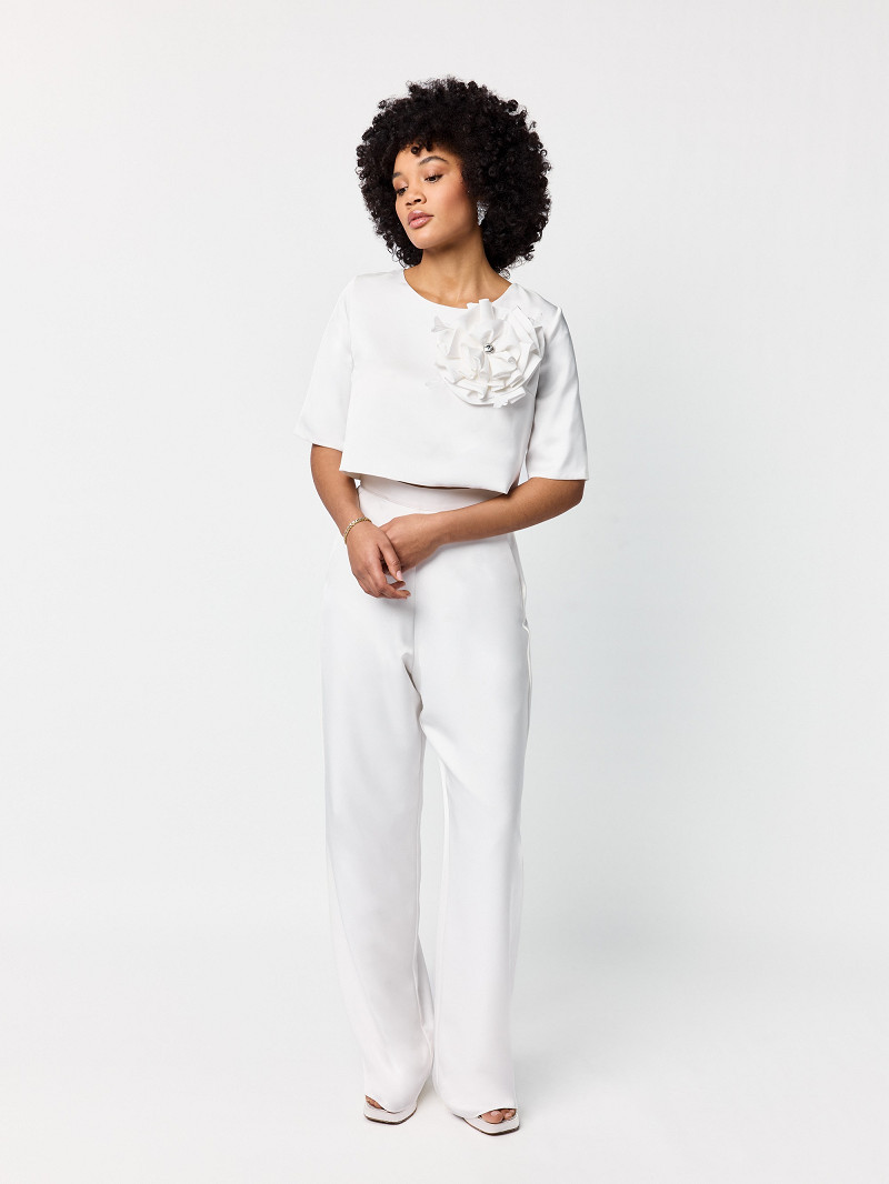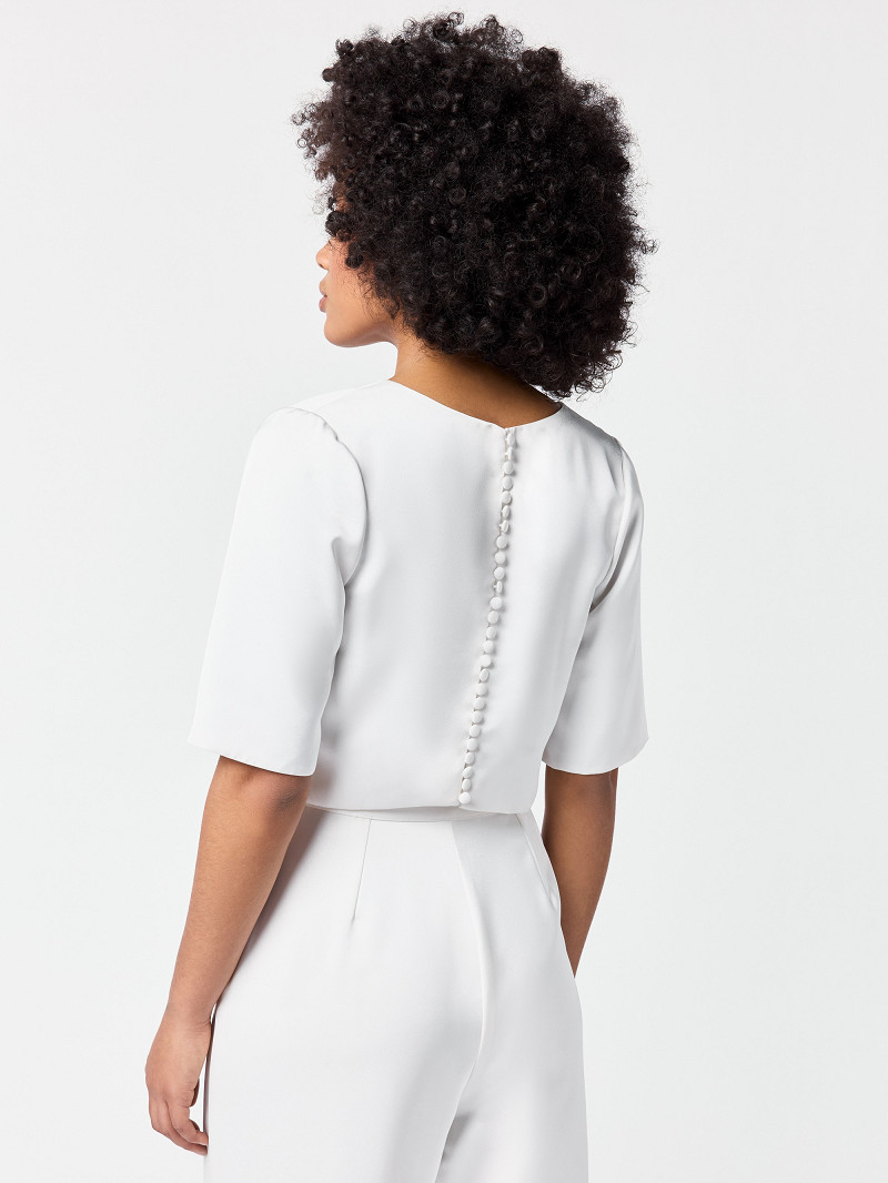 Bridal top gemaakt van ivoorkleurige matte satijn met boothals en korte gladde mouwen | GEM Collection | Lucia line