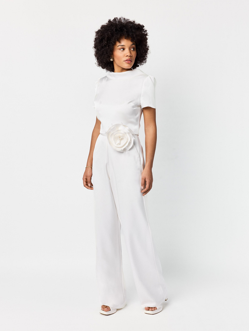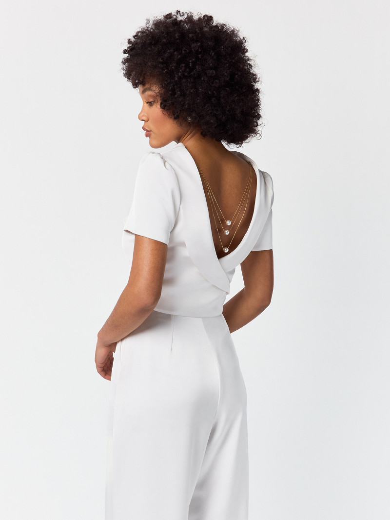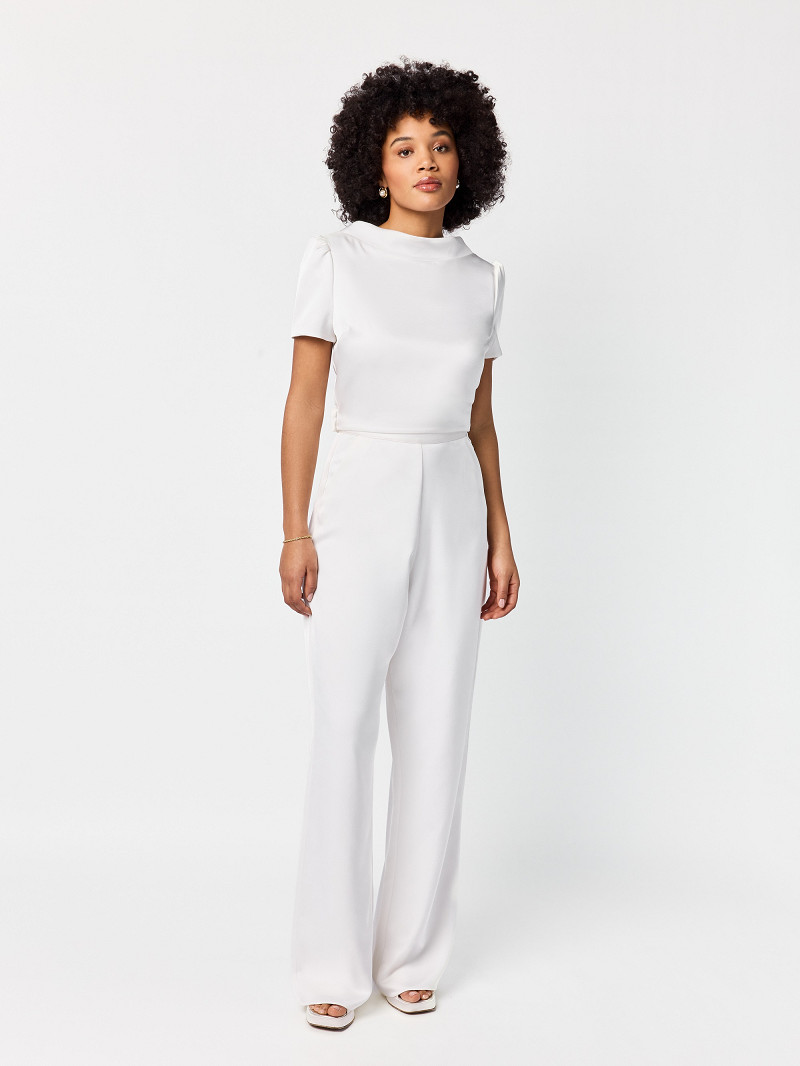 T-75401 - Elegante matte satijnen top met opstaande boothals, korte mouwtjes en diepe rug