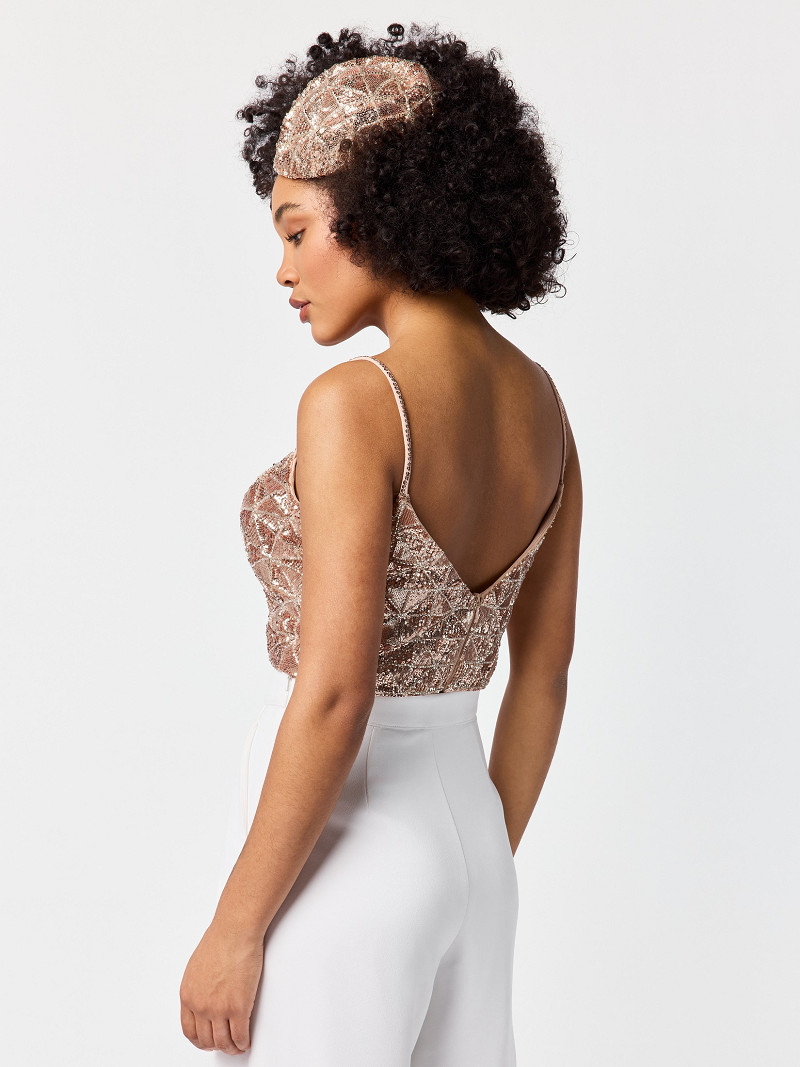 - Versierd met pailletten en beads in driehoekpatroon.
