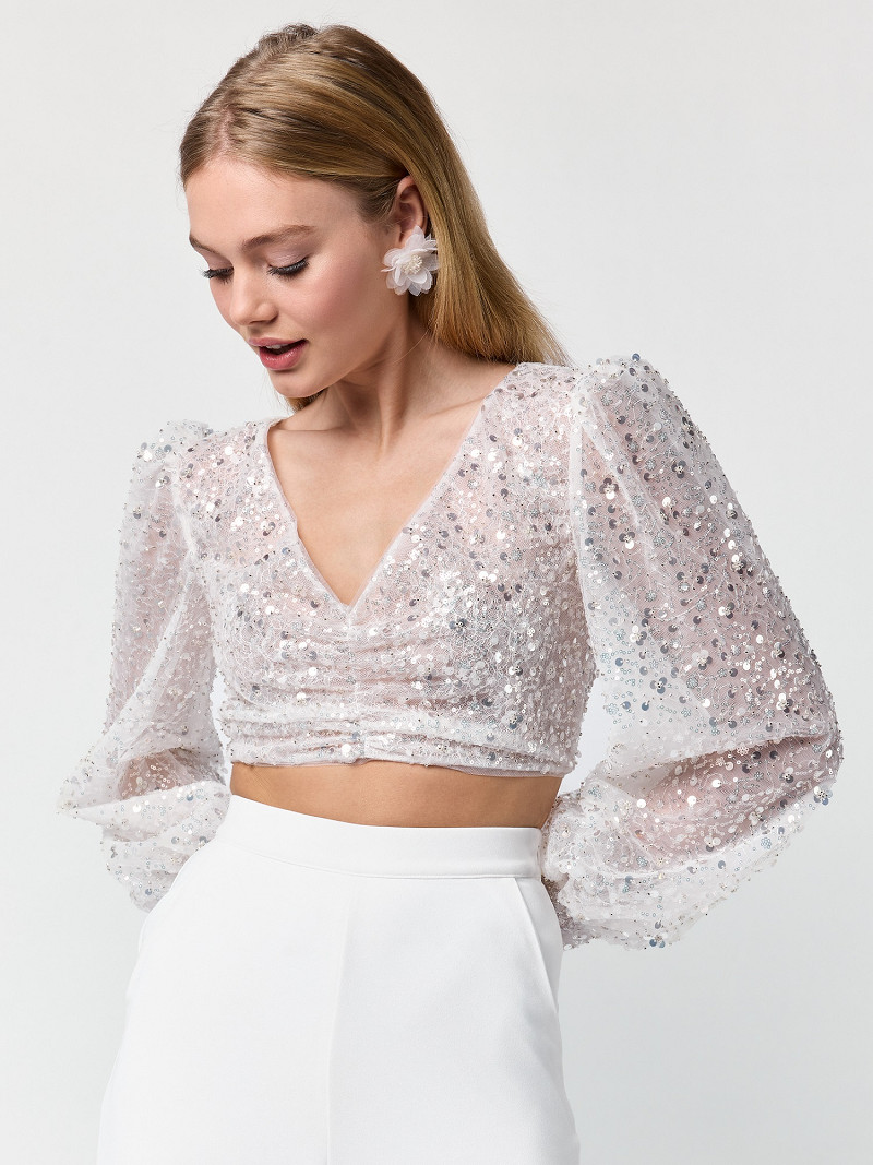 T-75426 - Schitterende top met pofmouwen, versierd met grote pailletten