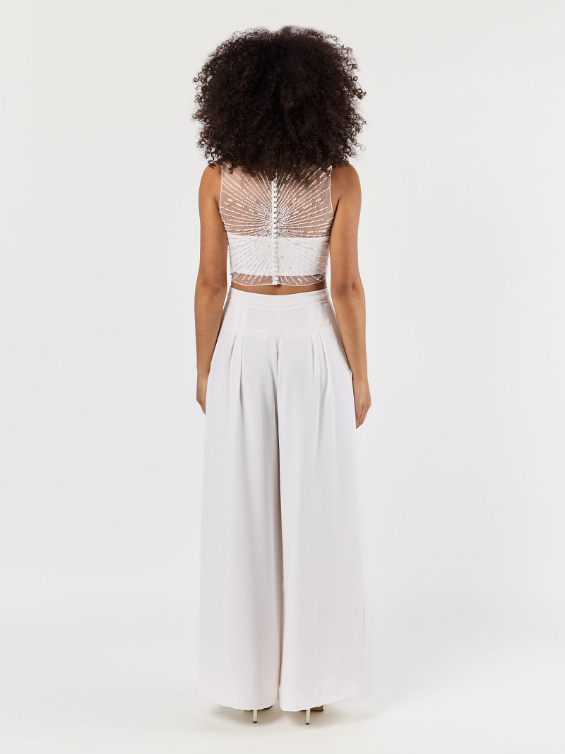 - Mouwloze ivoorkleurige tule top uit de Poirier Collection.