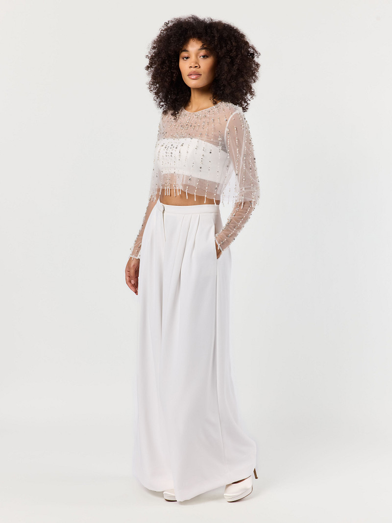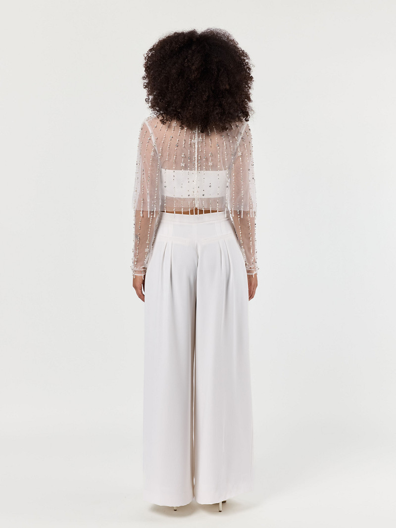 - Top met lange mouw van ivoorkleurige tule uit de Poirier Collection.