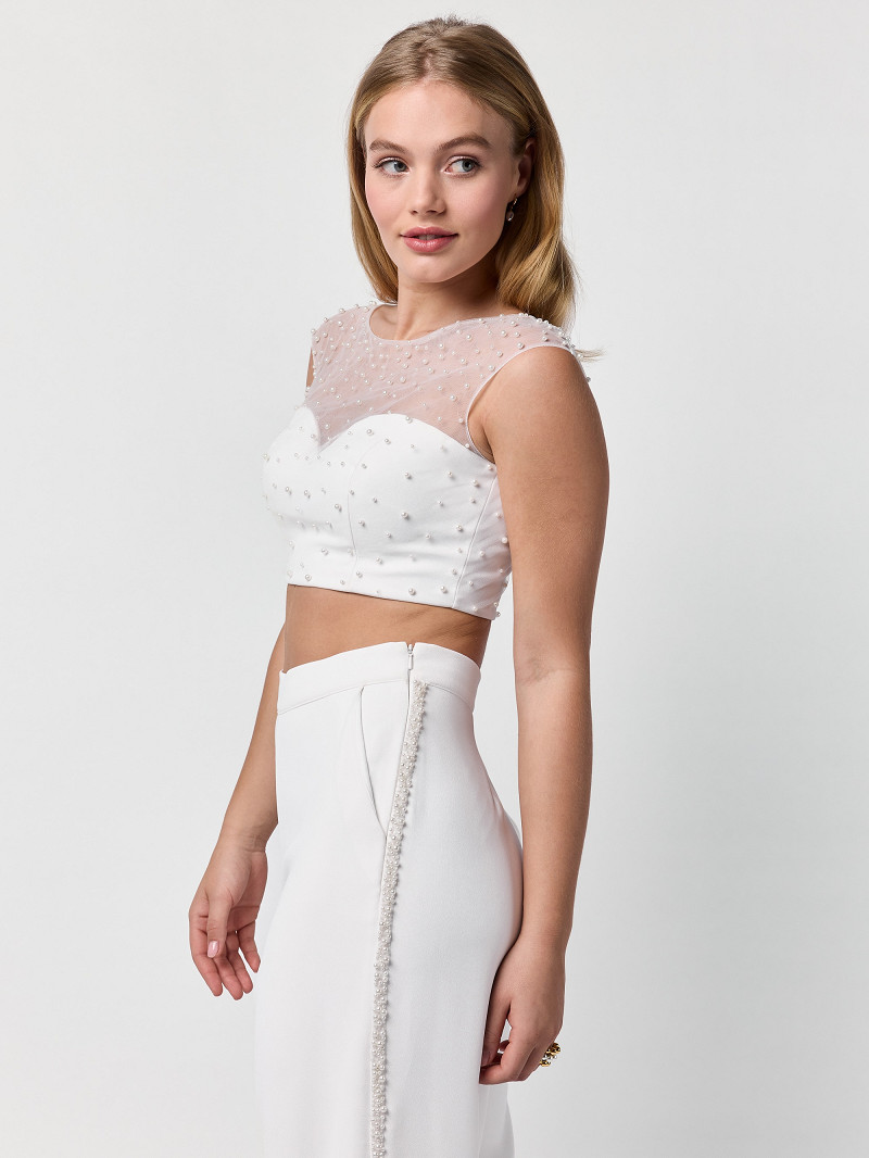 TR-75451 - Sierlijke pantalon van ivoorkleurige crêpestof voorzien van een bies van pareltjes | Gisèle-lijn