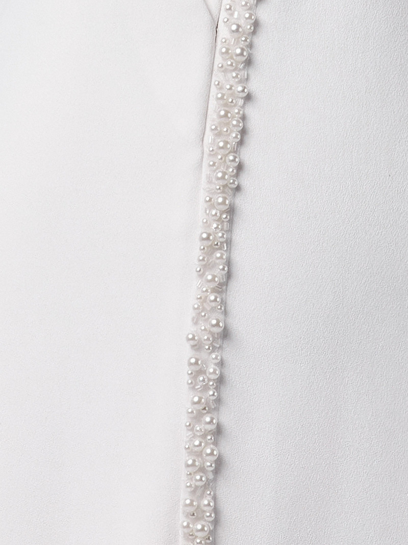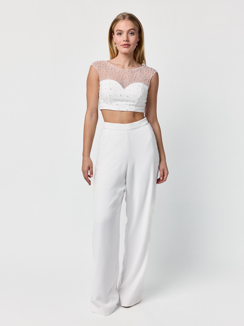TR-75451 - Sierlijke pantalon van ivoorkleurige crêpestof voorzien van een bies van pareltjes | Gisèle-lijn