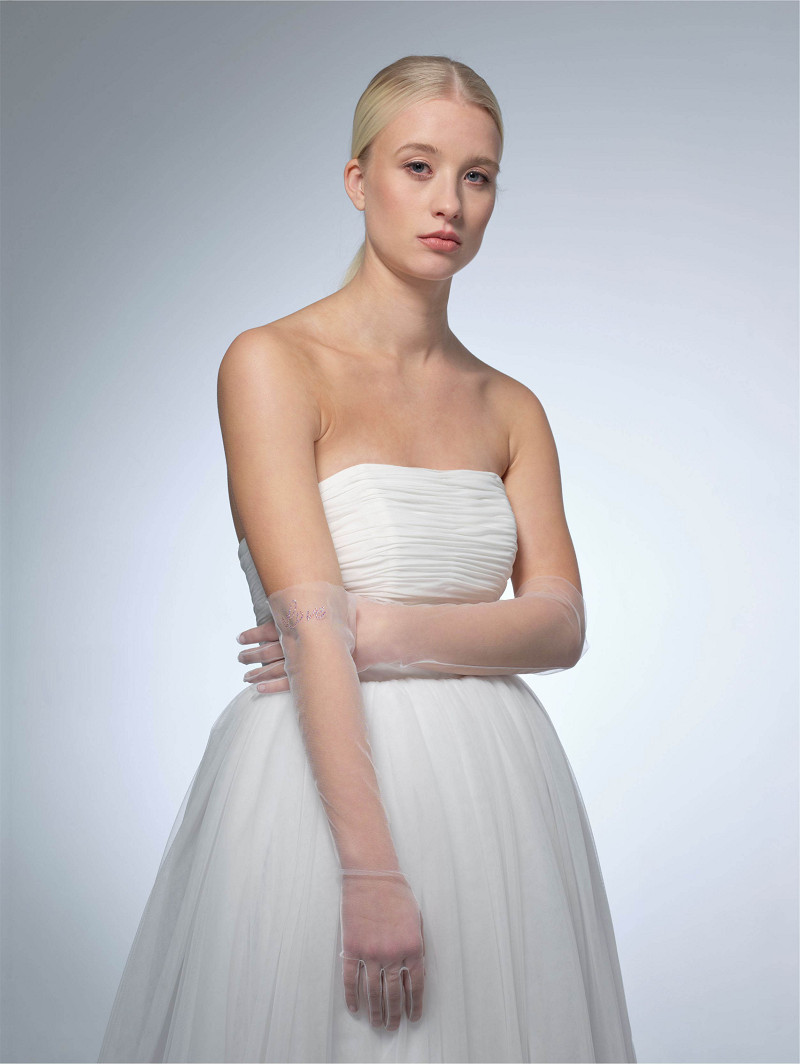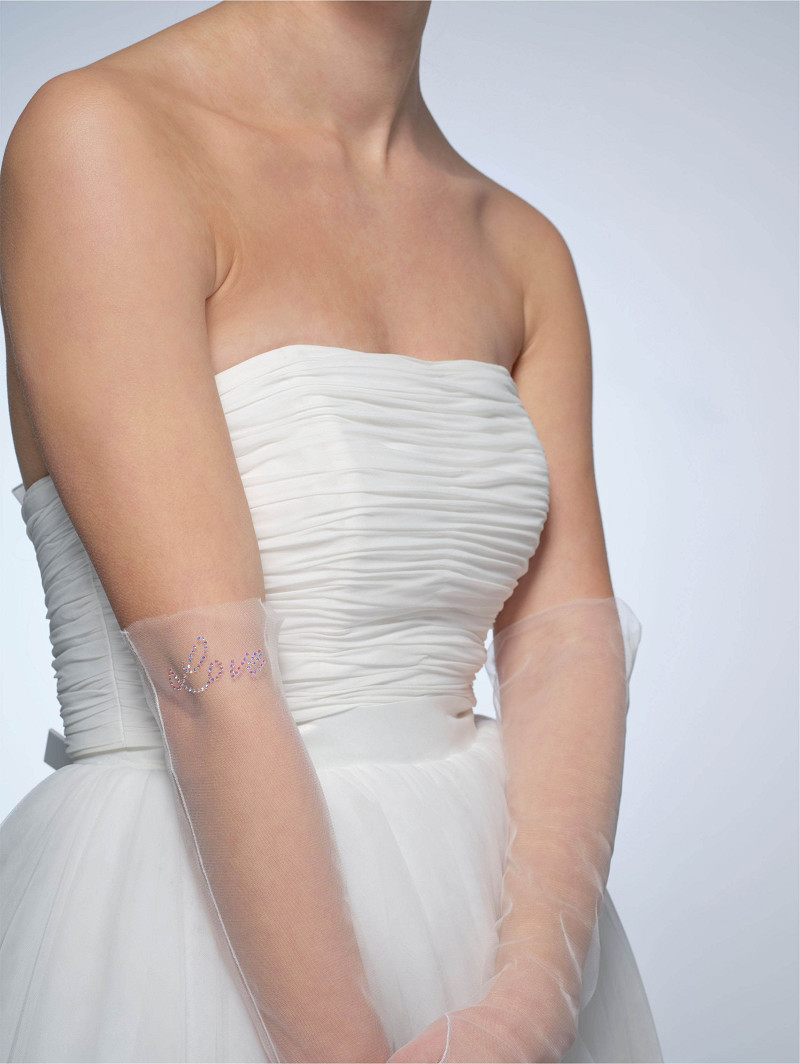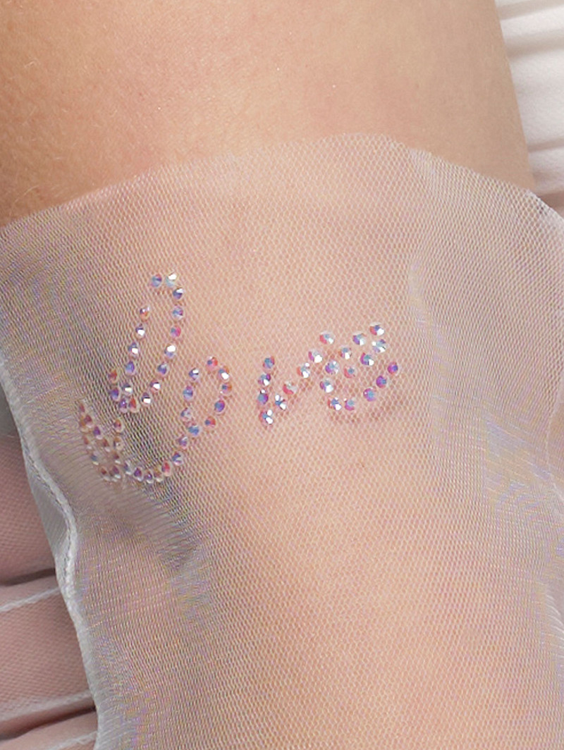 Handschoenen gemaakt van soft-tule met bovenaan het woord “Love” in A/B strasssteentjes (multi-colour) | lengte: 50 cm