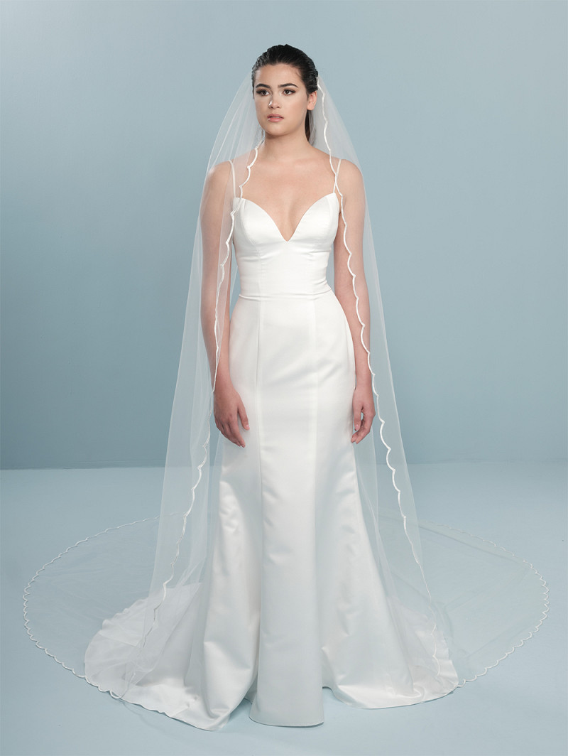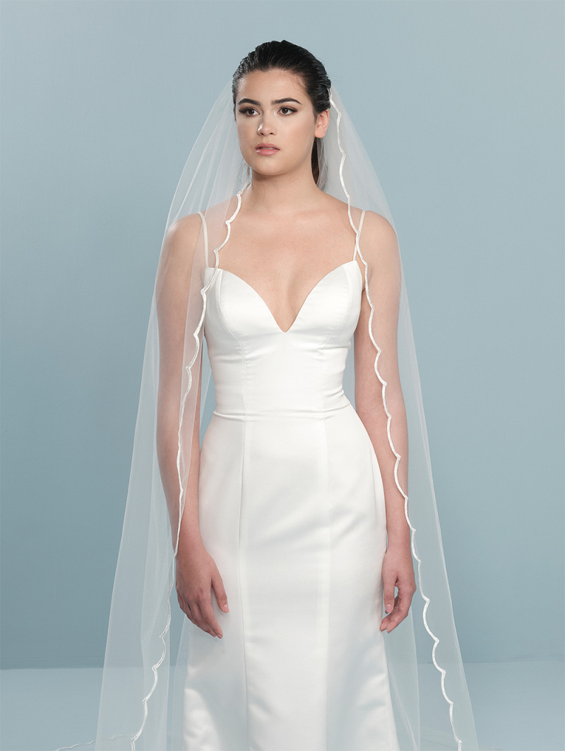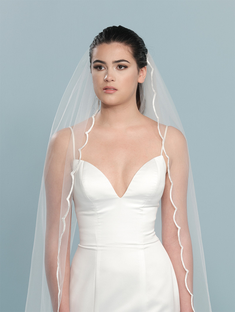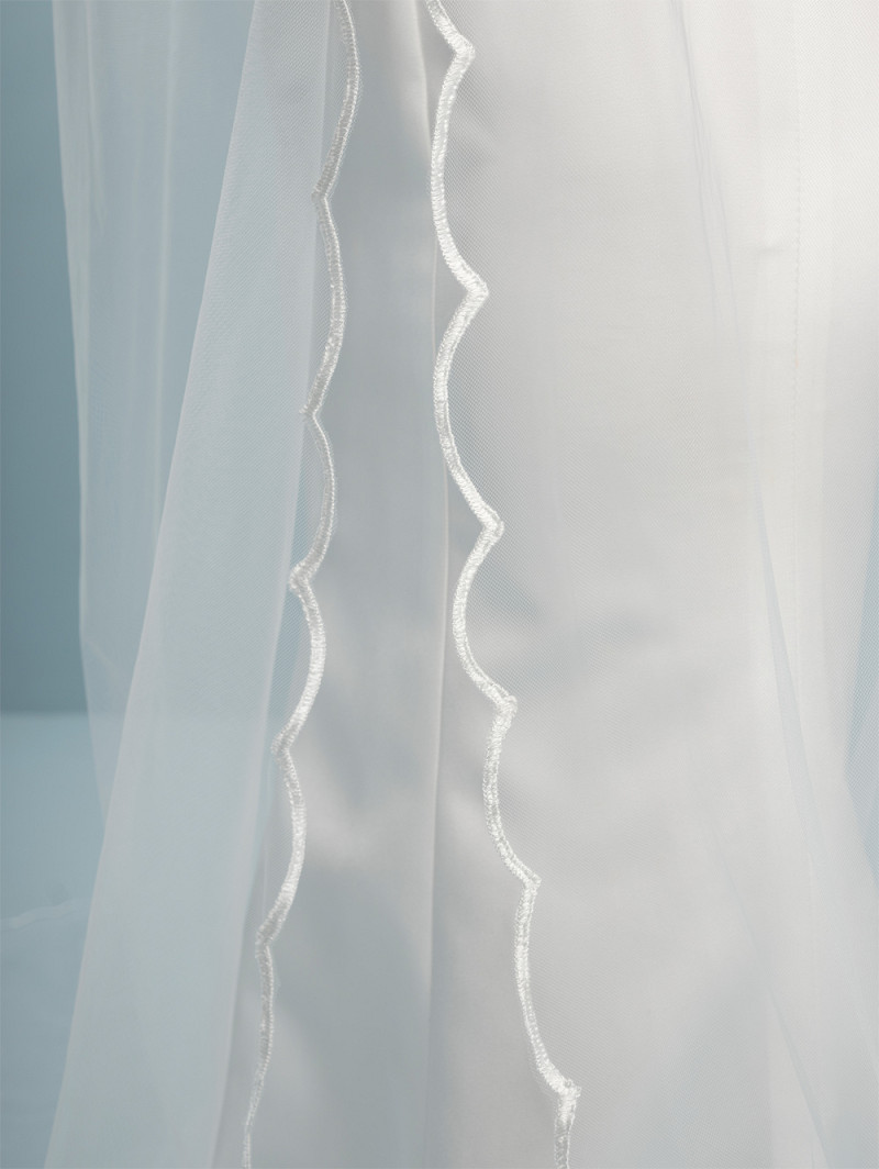 - Kenmerken: ivoorkleurige medium-tule sluier, geborduurde randen en tekst, pailletjes