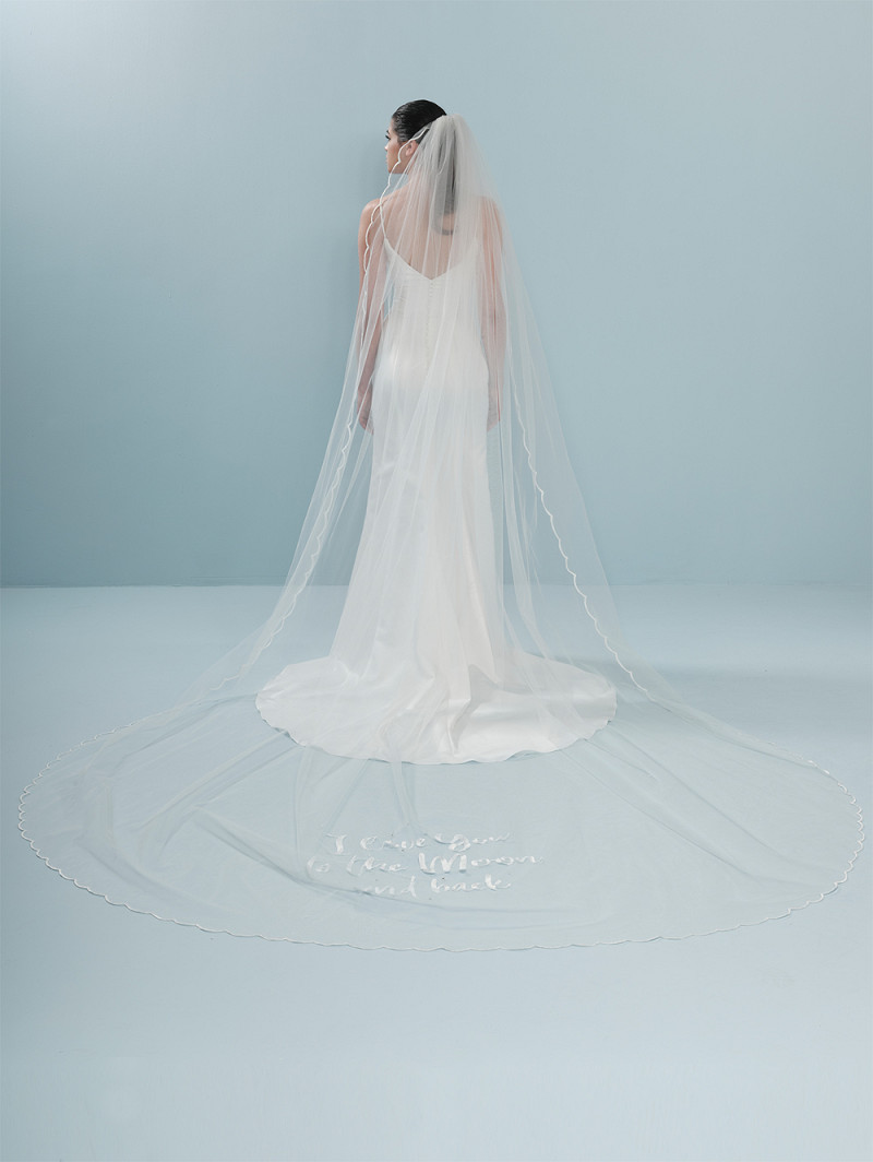 - Product: S412-350/1/medium – ivoorkleurige tule sluier met geborduurde randen in golfpatroon en eveneens de geborduurde tekst “I love you to the moon and back”