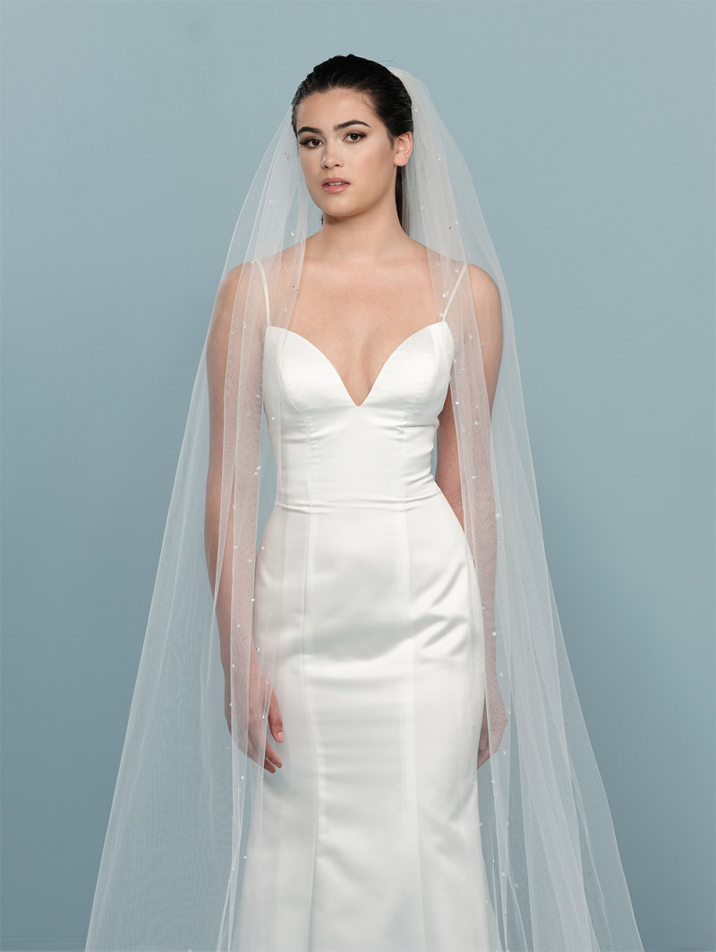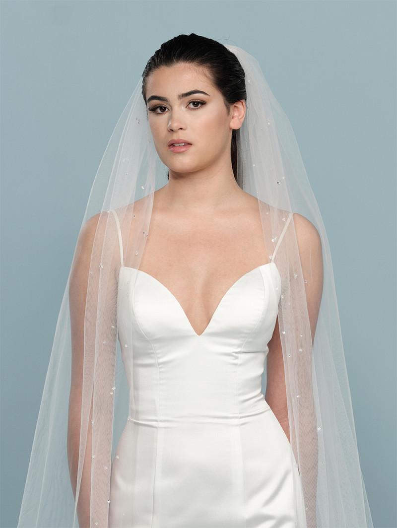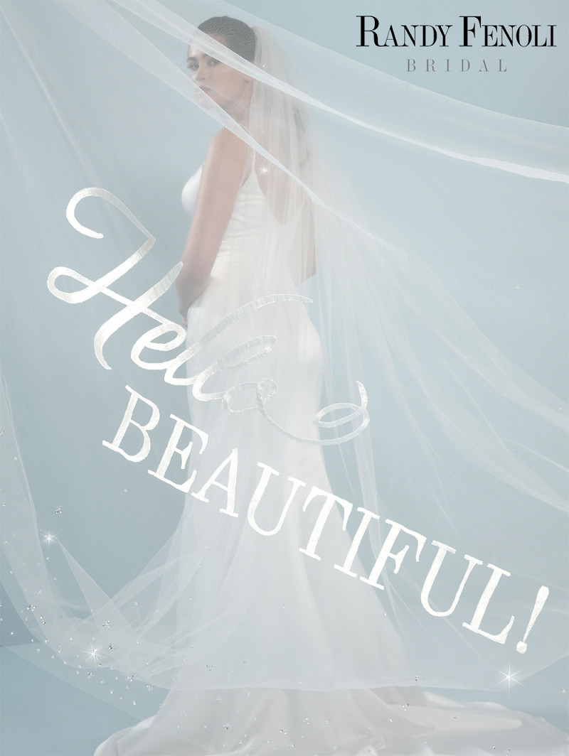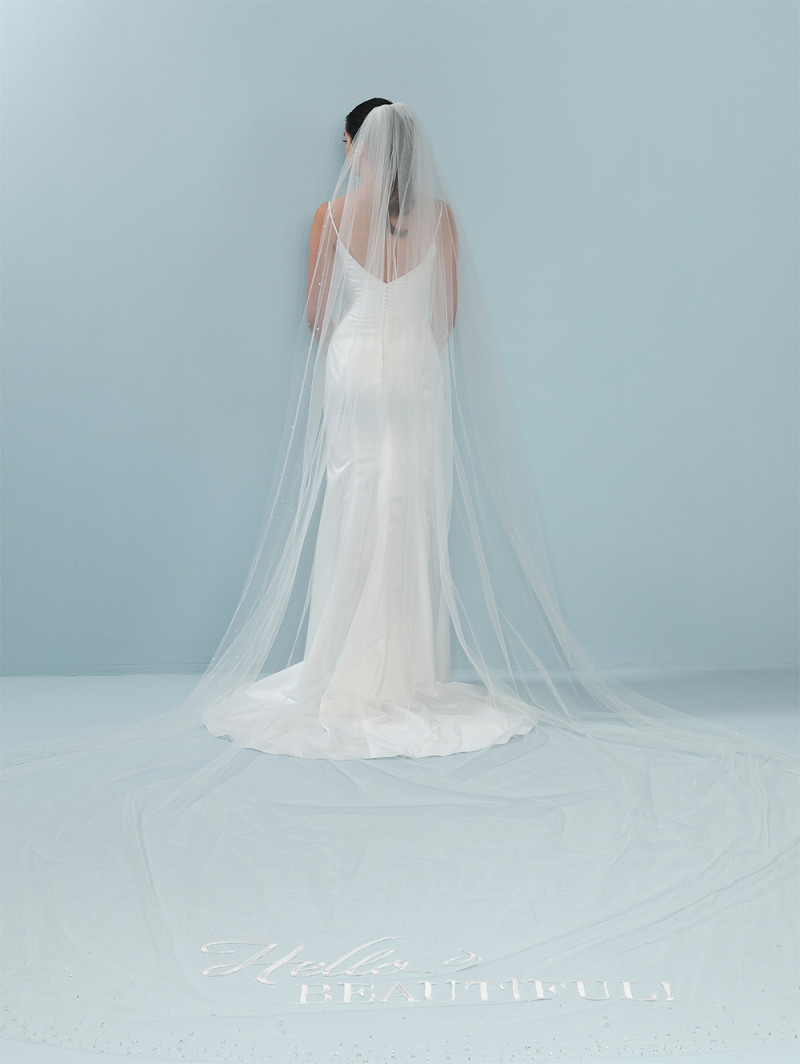 - Enkellaags ivoorkleurige medium-tule sluier, versierd met kristallen, pailletjes en de geborduurde tekst “Hello Beautiful”, dé slogan waarmee Randy Fenoli iedere bruid aanspreekt in het TV-programma Say Yes to the Dress