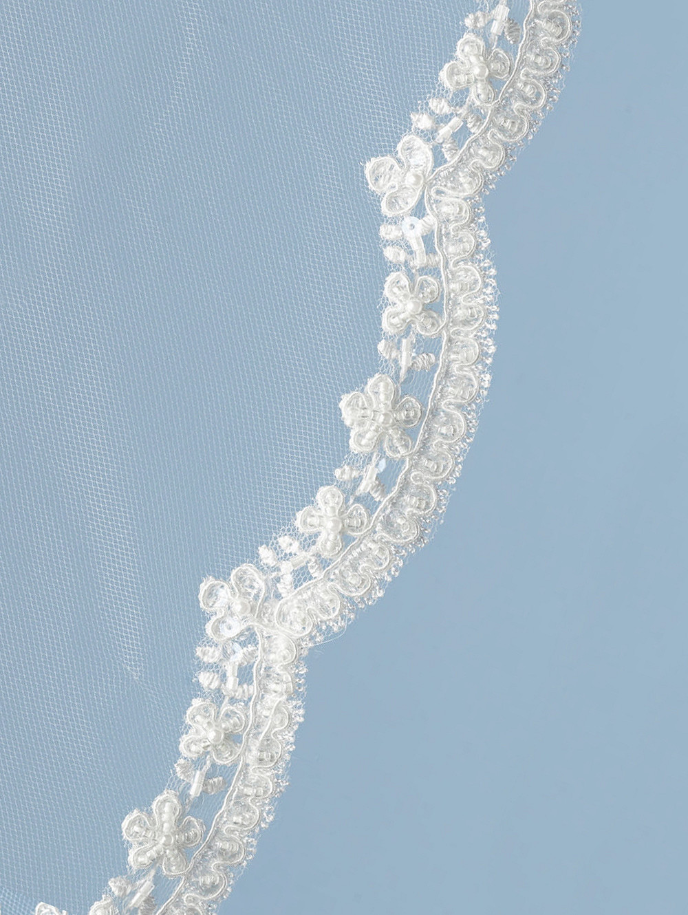 Enkellaags sluier in soft tule, met smalle geschulpte kanten afwerking versierd met parels en pailletten. Lengte 120 cm.Ook leverbaar in andere lengtes.